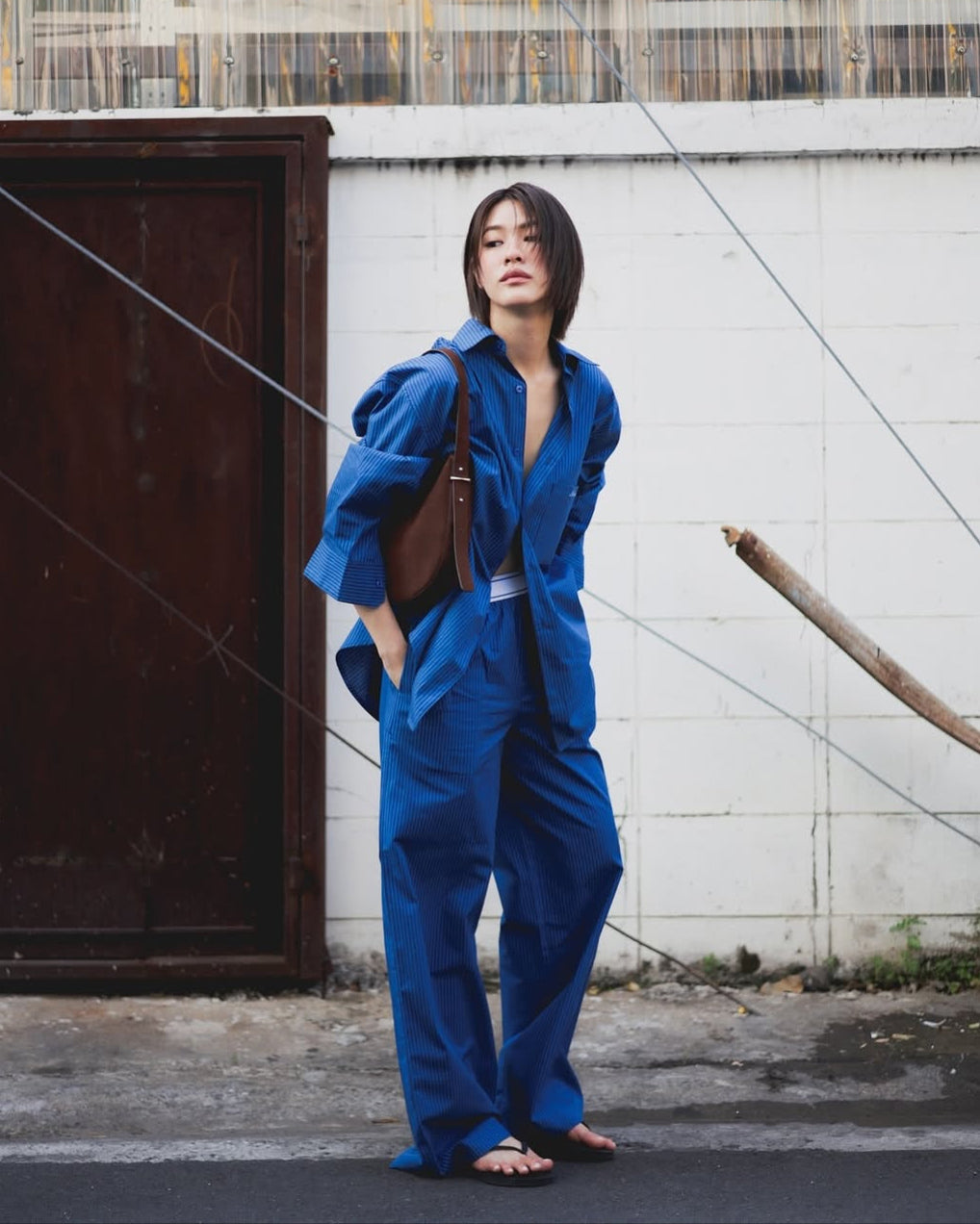 We caught a glimpse of Emi Thasorn Klinnium serving timeless style in pieces from our Hotelier collection. She wears the AIMER Essential Oversized Shirt in Stripe paired effortlessly with the AIMER Elastic Cotton Trousers — a look that blends relaxed tailoring with everyday sophistication.